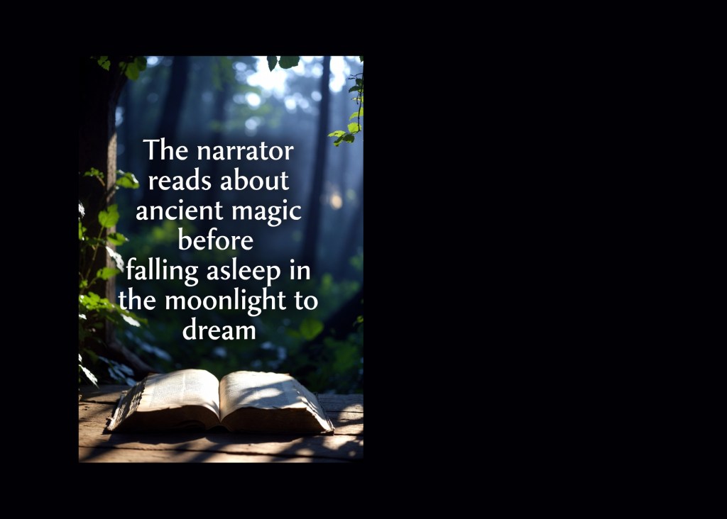 [The narrator reads about ancient magic before falling asleep in the moonlight to dream]